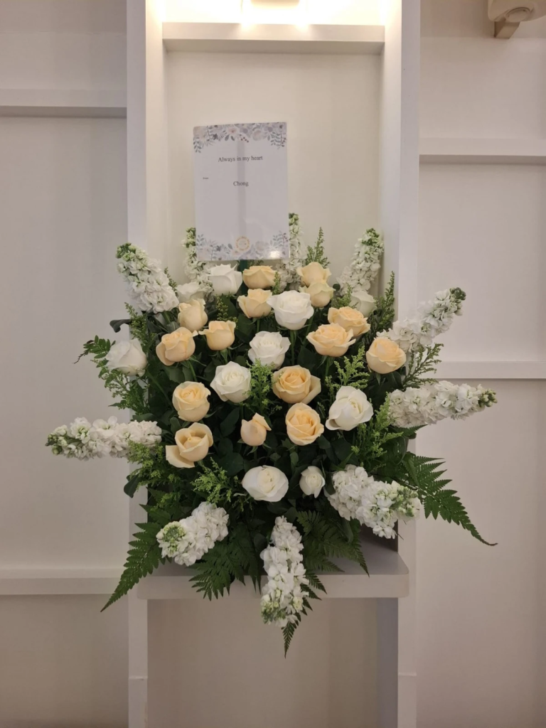 Our condolence stand features white matthiola, white roses, champagne roses, golden phoenix and additional foliage.