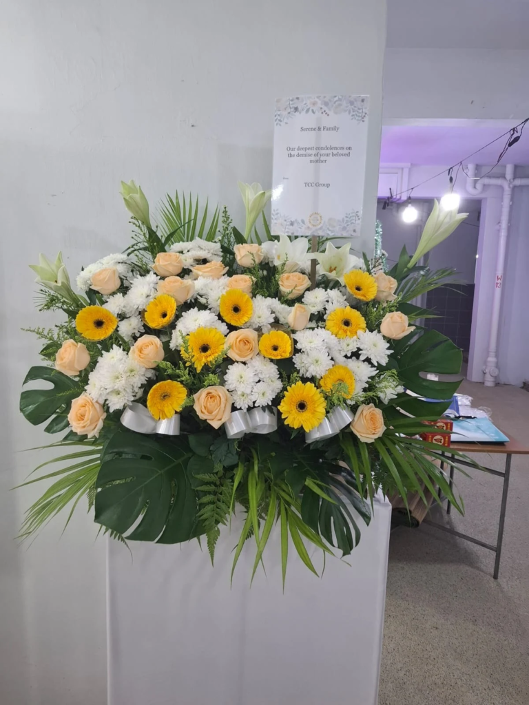 Our Deepest Heartfelt condolence stand features yellow gerbera, yellow roses, white gladiolus or mathiola, white lilies, white pom pom, monstera, yellow palm and additional foliage.