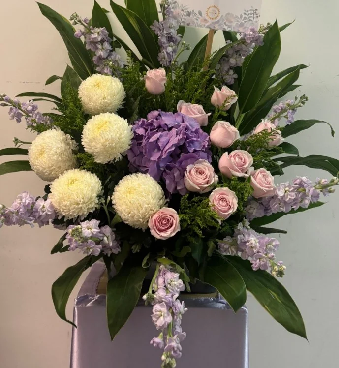 The Gentle Peace Condolences stand features purple matthiola, silk purple hydrangea, light pink rose, white daisy, white spider, green cordyline and additional foliage.
